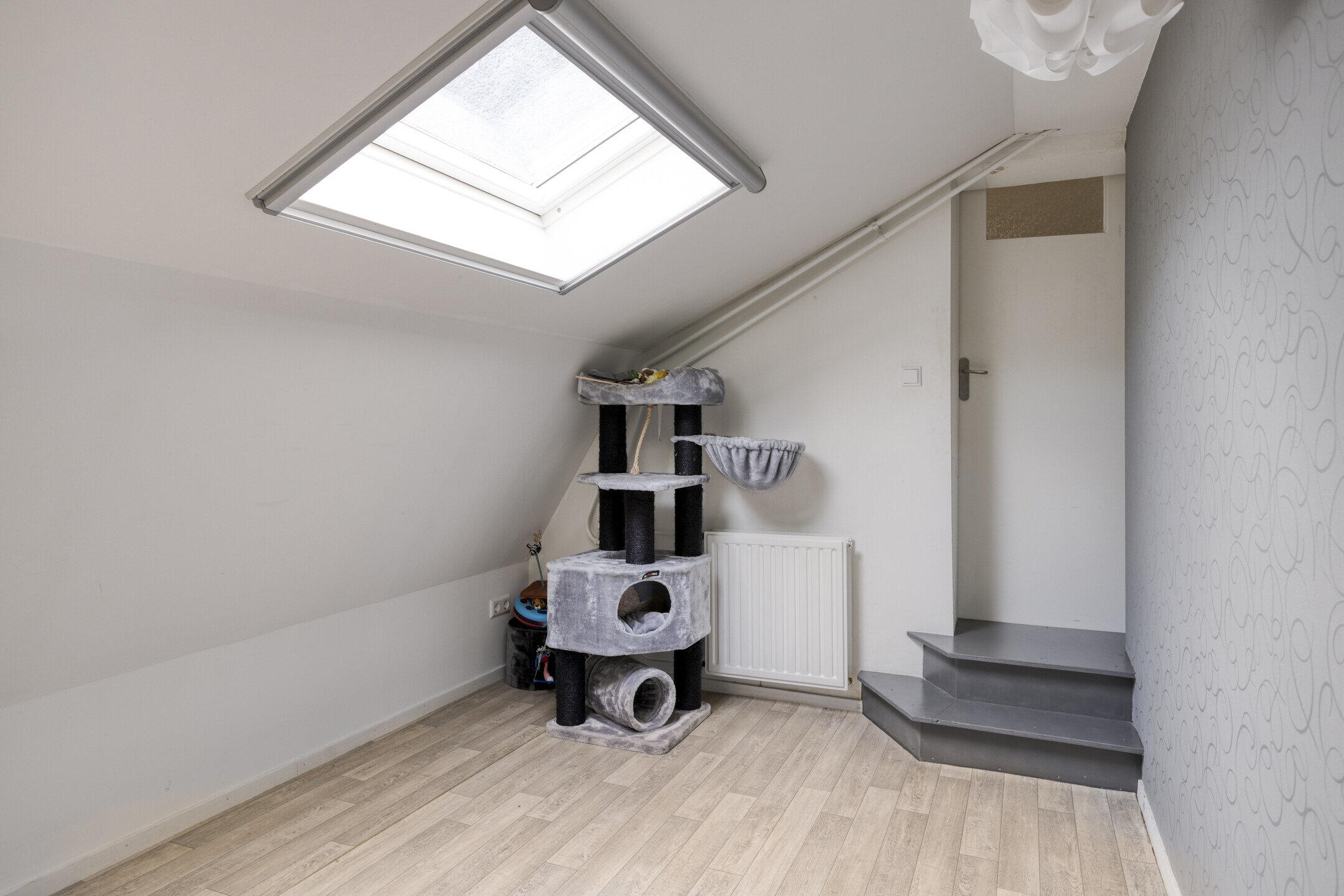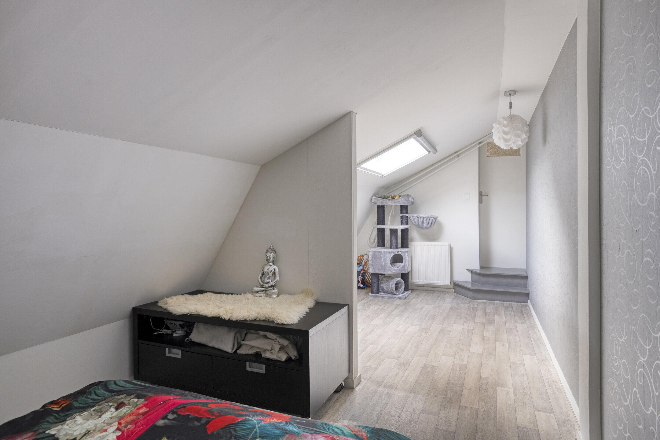 Op de eerste verdieping vind je drie slaapkamers en een zeer ruime overloop met voldoende plek voor kasten of extra opbergruimte. Ideaal voor gezinnen of voor wie graag een werk- of hobbykamer wil creëren. De moderne badkamer bevindt zich op de begane grond en is compleet uitgevoerd met een inloopdouche en een stijlvol wasmeubel. Op de eerste verdieping is er een separaat toilet én een praktische was-/droogaansluiting aanwezig. Comfort en functionaliteit gaan hier hand in hand.